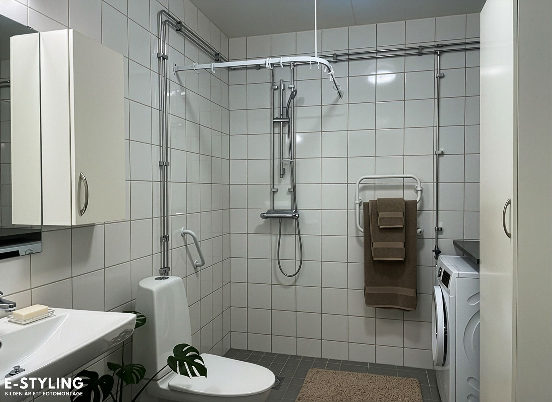 Badrummet är fräscht och funktionellt med vitkaklade väggar och mörkgrå klinkergolv. Här finns tvättställ, wc och dusch samt bekvämligheter som handdukstork och en kombinerad tvätt- och torkutrustning.