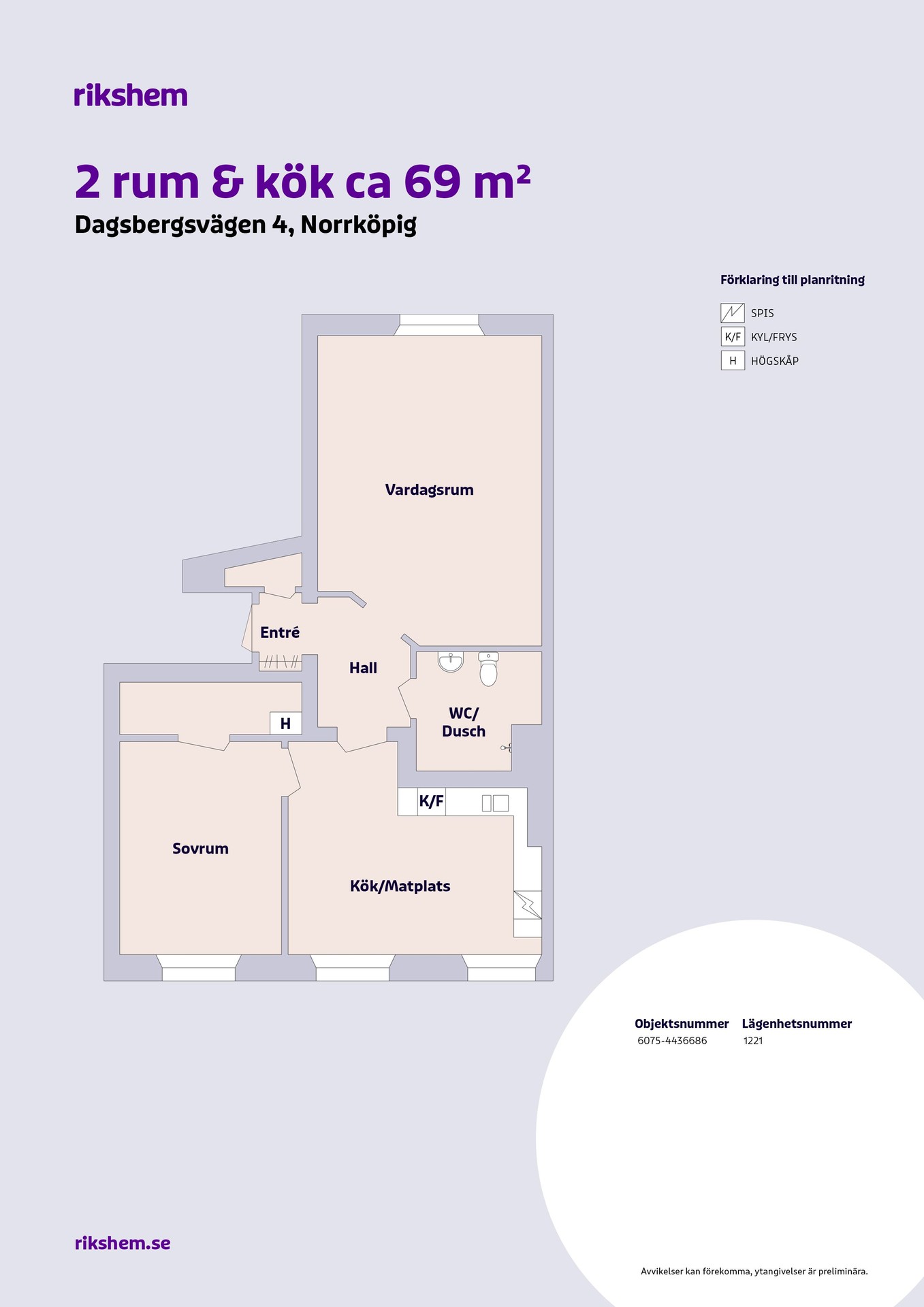 Rikshem reserverar sig mot eventuella fel eller avvikelser som kan förekomma i lägenhetsannonsen eller i planritningen.