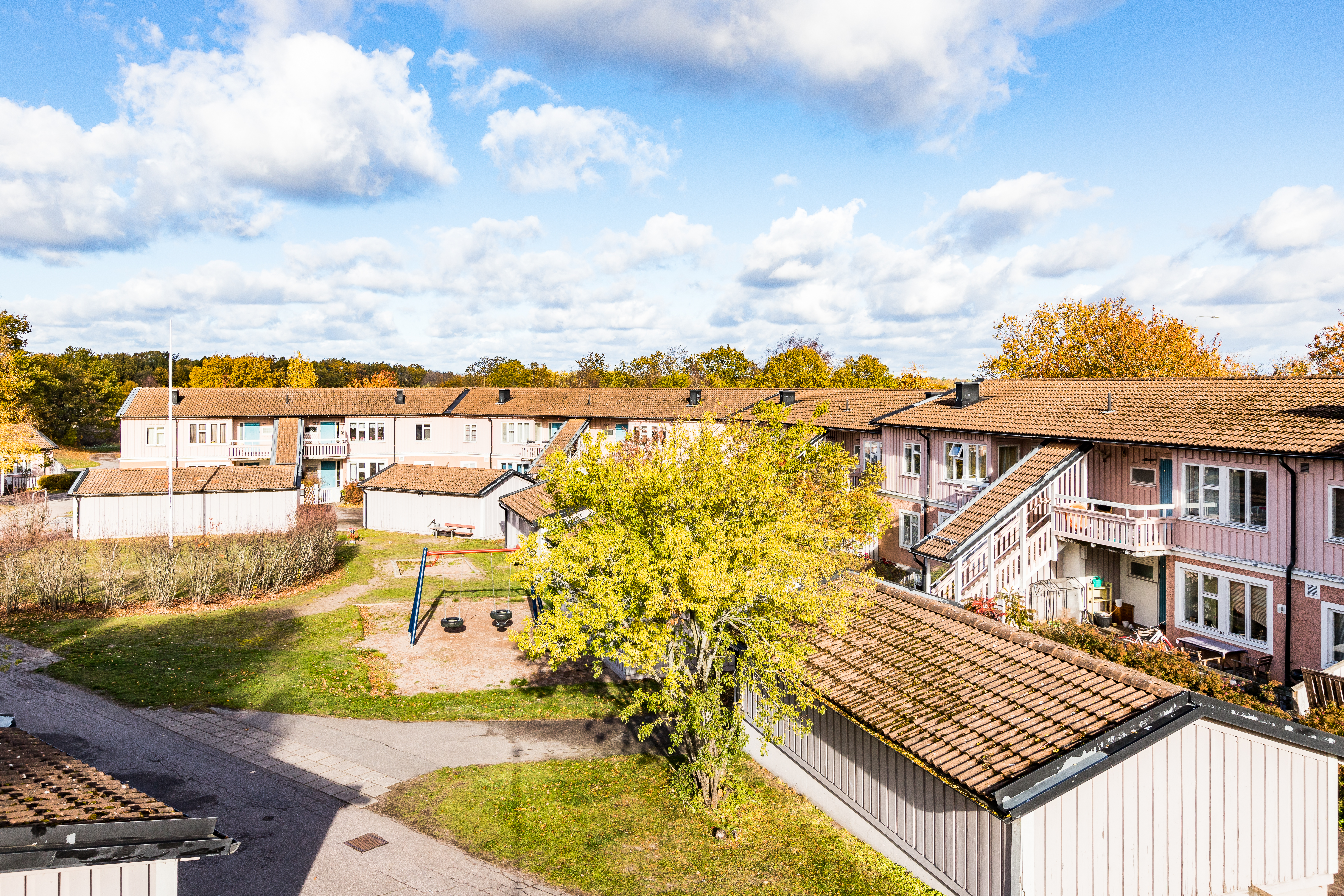 Den digitala visningen är från en lägenhet 1 trappa upp. Denna lägenhet har således även en dörr ut till uteplatsen på baksidan. Dörren finns i vardagsrummet.