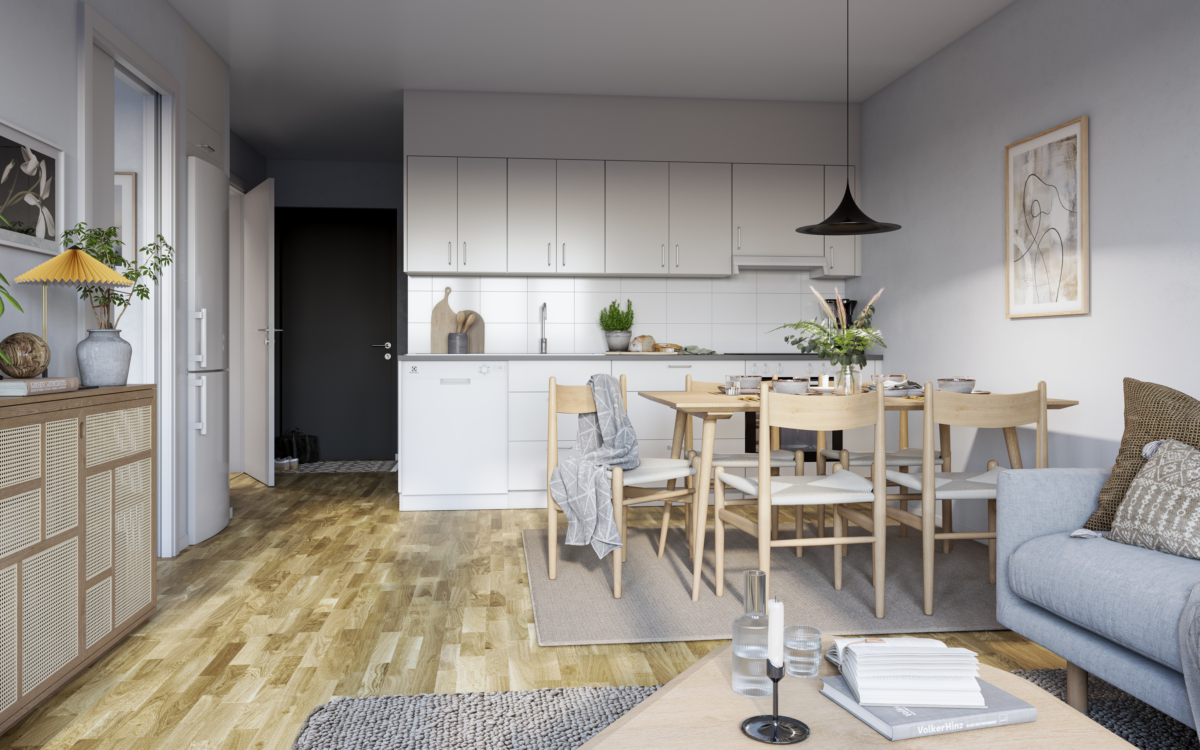 Vidare in i lägenheten finner du kök och vardagsrum i en social öppen planlösning. Köket har vita släta skåpluckor, kyl/frys samt diskmaskin. Rummet badar i ljus tack vare stora fönster och har utgång till den mysiga balkongen – perfekt för avkoppling.