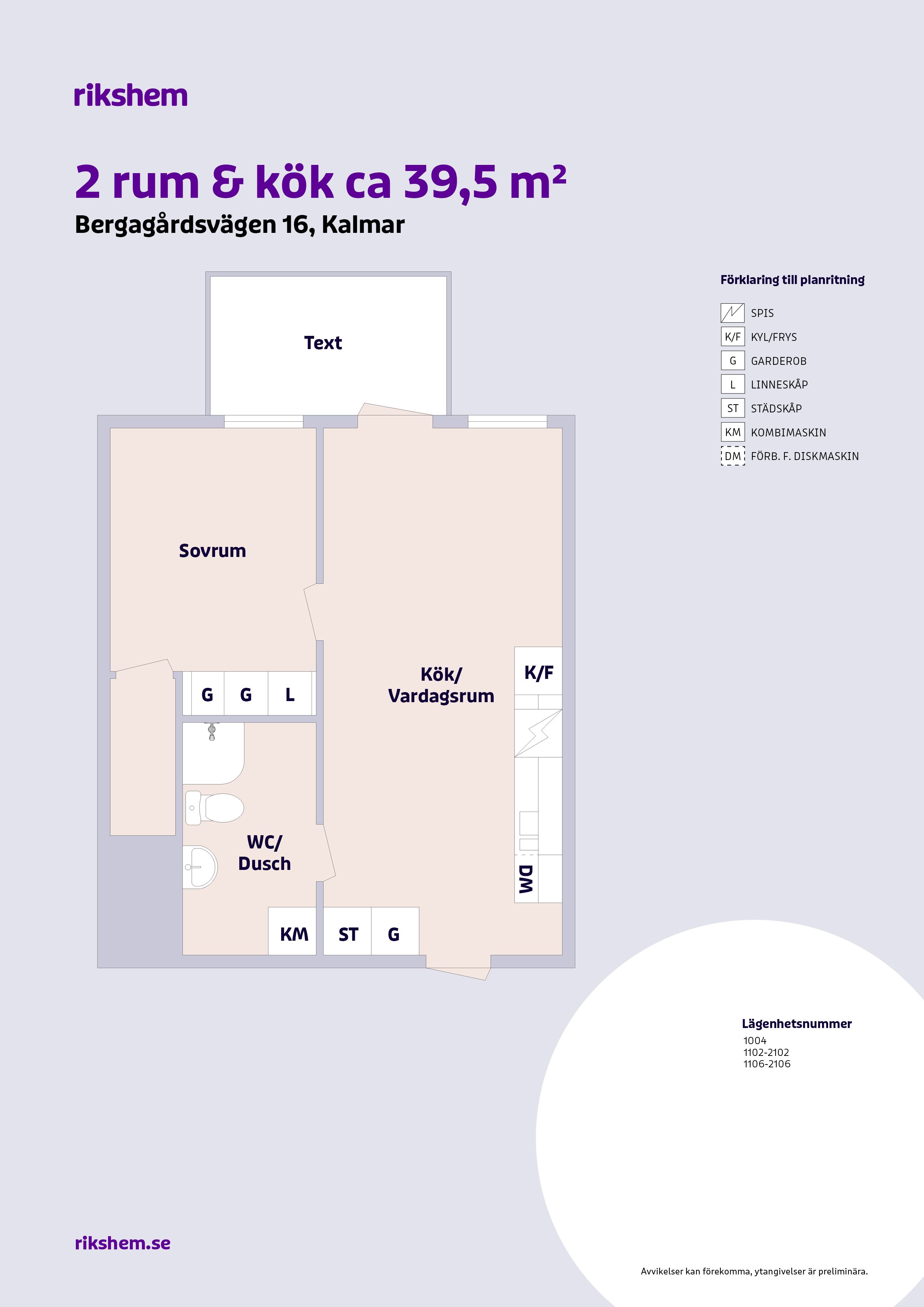 Rikshem reserverar sig mot eventuella fel eller avvikelser som kan förekomma i lägenhetsannonsen eller i planritningen.