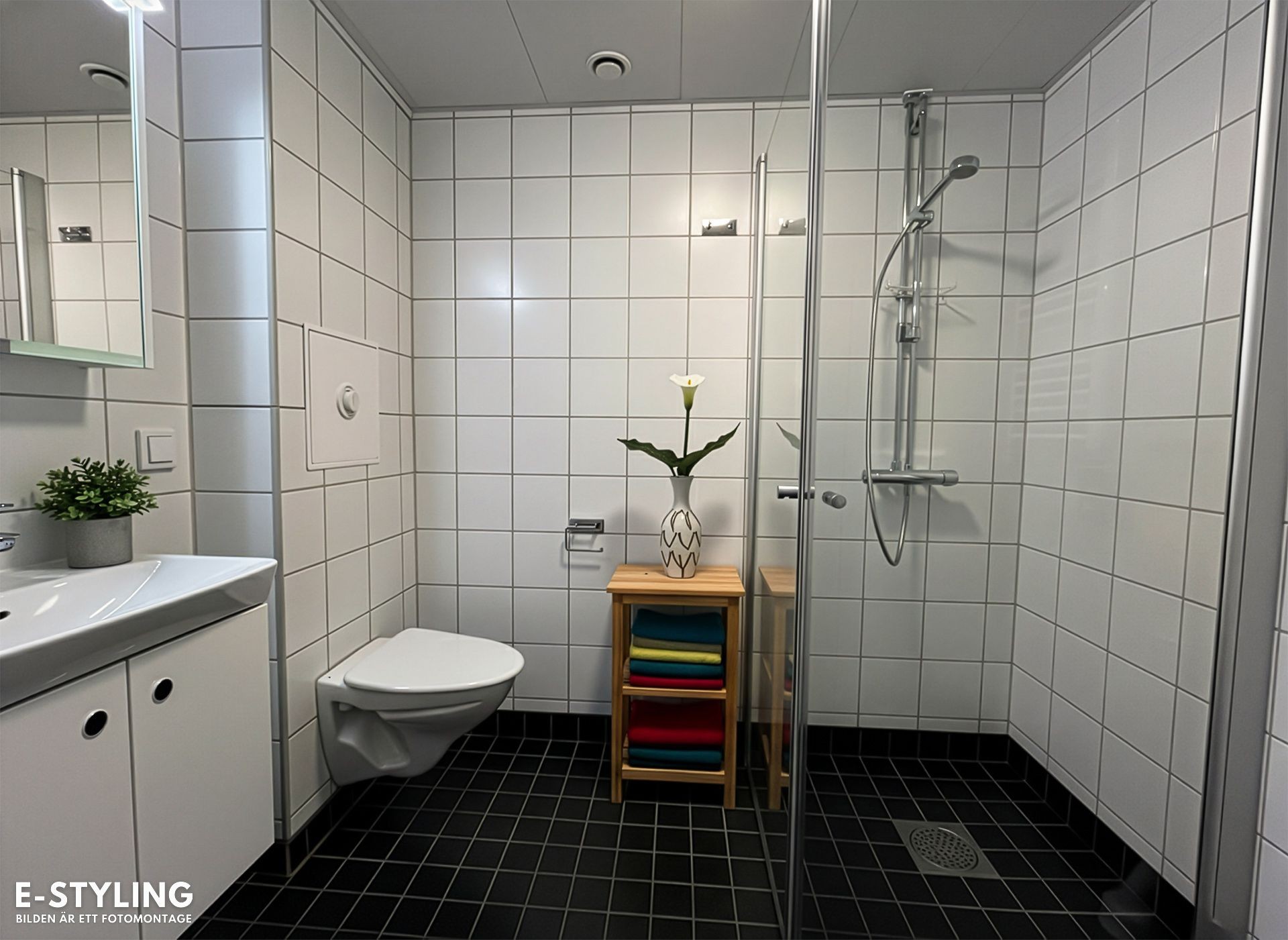 Badrum med vitt kakel och grå klinkers, toalett, tvättställ, dusch och badrumsskåp ovan tvättställ.