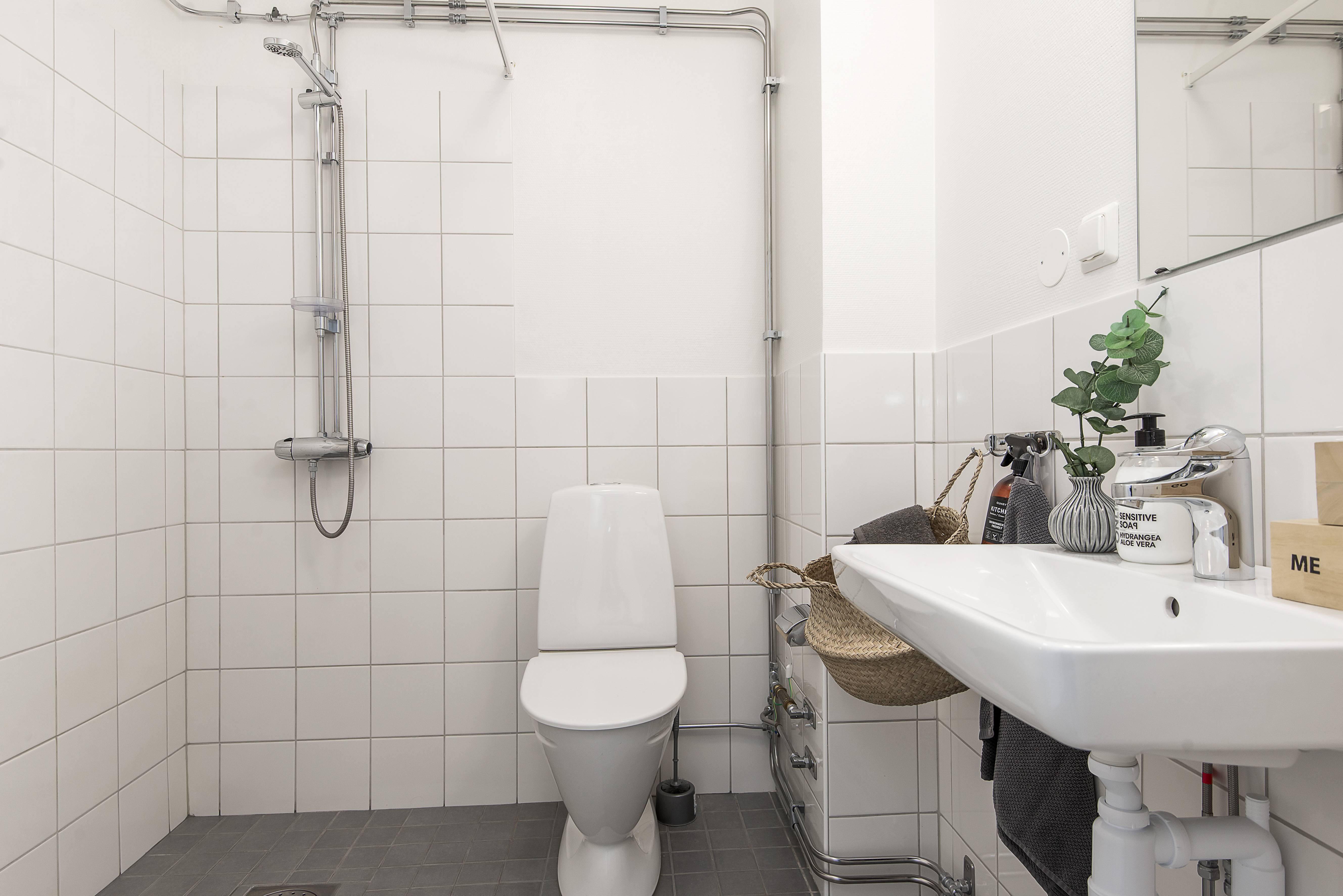 - Ett rymligt badrum med vitt kakel och ljusgrå klinkers som är utrustat med tvättställ, spegelskåp och wc samt dusch hörna samt förberett för tvättmaskin och torktumlare.