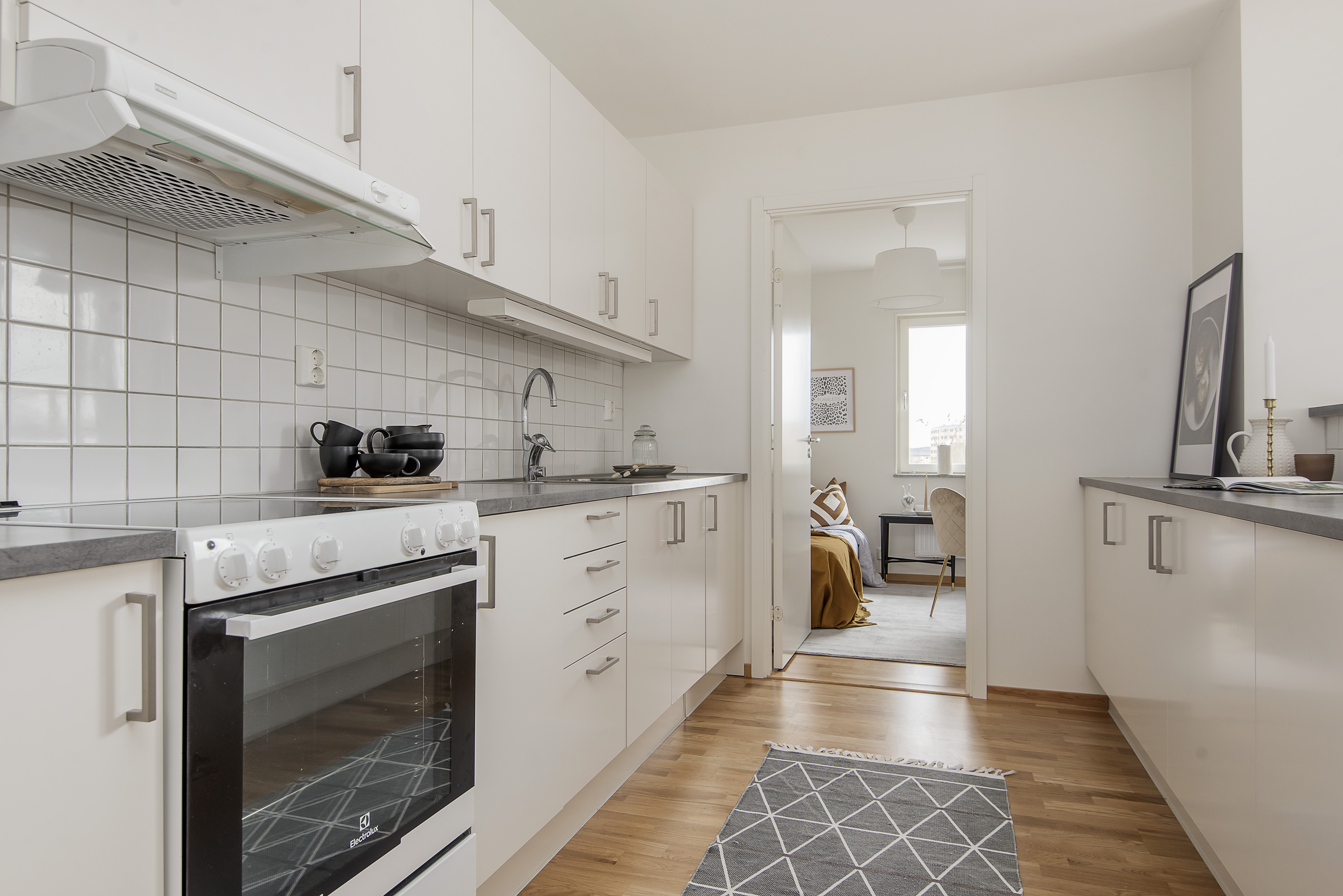 - Ett ljust kök med vitt kakel, vita köksluckor och grå bänkskiva. Köket är utrustat med kyl/frys, spis med glaskeramikhäll. Gott om förvaring. Förberett för diskmaskin.