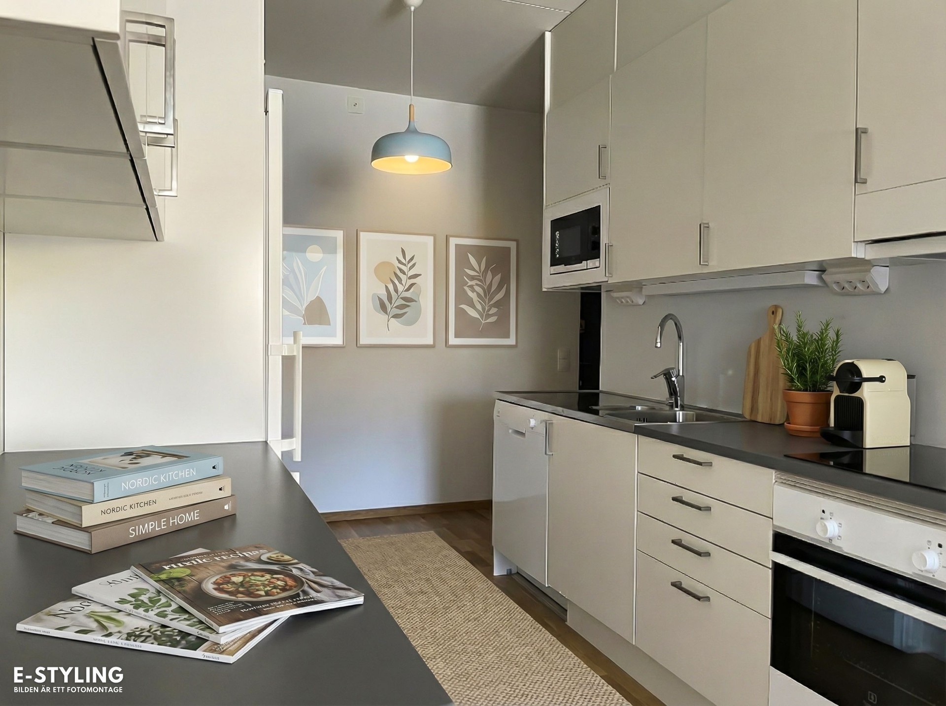 -Köket är från Marbodal med vitvaror från Electrolux. Fullt utrustat med spishäll, ugn, inbyggd mikrovågsugn, diskmaskin och kyl/frys. Det finns gott om förvaring i överskåp längs ena väggen och i de öppna hyllorna längs den andra. Grå bänkskivor på båda sidor av köket för bra arbetsytor.