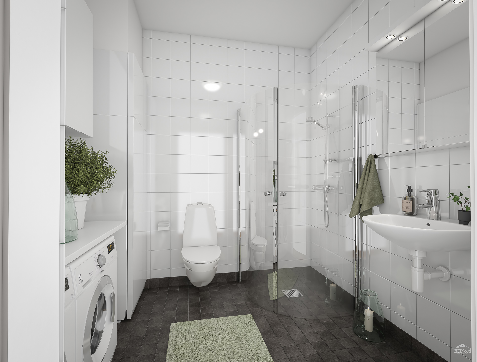 -Badrummet är hel kaklat med grå klinker och vitt kakel. Det är utrustat med både tvättmaskin och torktumlare från Electrolux samt en arbetsbänk meddubbla överskåp. Dusch väggar som du kan fälla in.