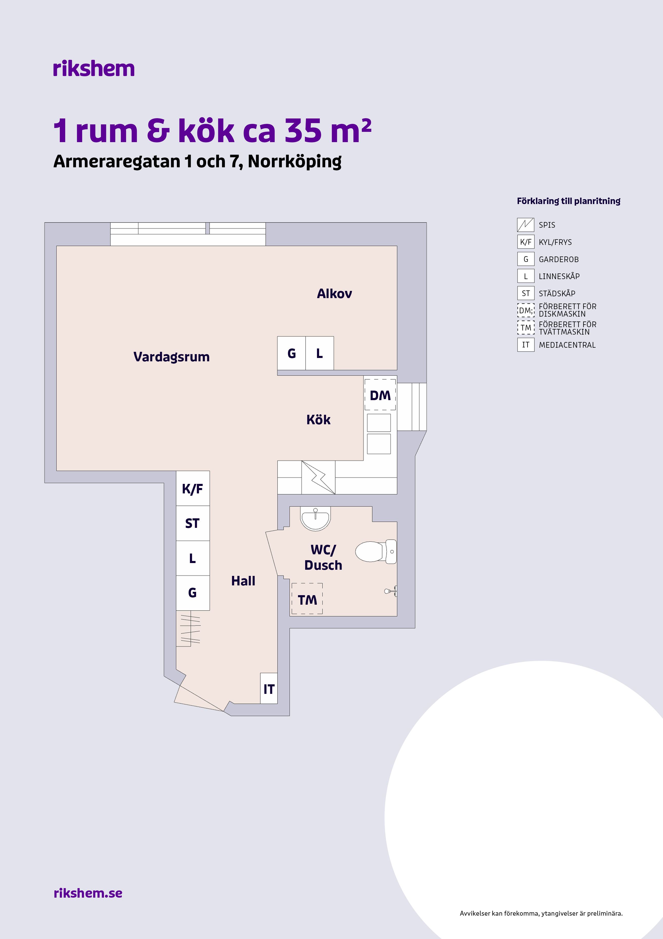 Rikshem reserverar sig mot eventuella fel eller avvikelser som kan förekomma i lägenhetsannonsen eller i planritningen.