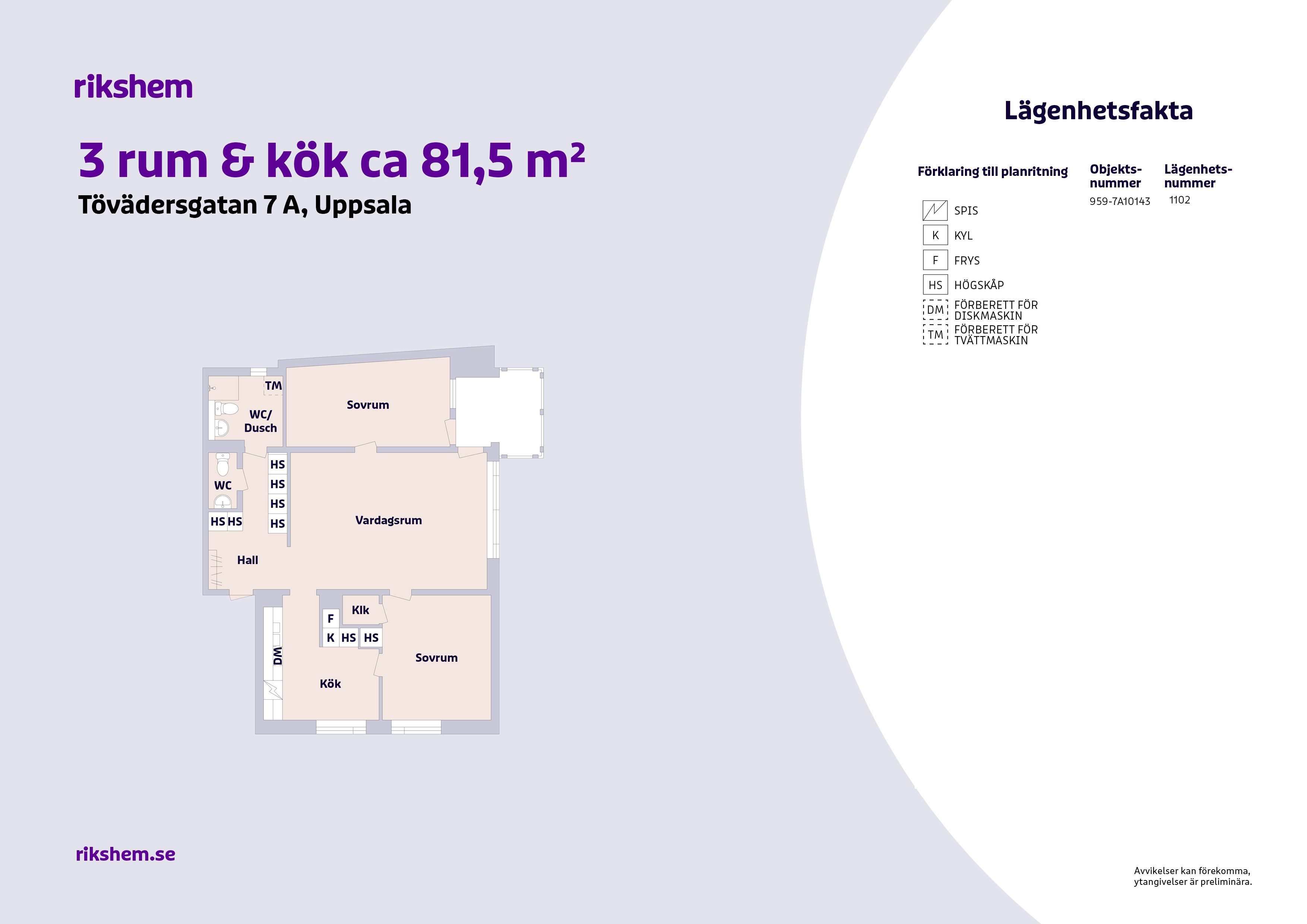 Rikshem reserverar sig mot eventuella fel eller avvikelser som kan förekomma i lägenhetsannonsen eller i planritningen.